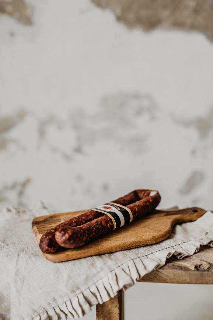 Hagyományosan készült, húsban gazdag magyar kézműves kolbász. A fűszerezés "csabai" típusú (fűszerpaprika, friss fokhagyma, köménymag, só). Csak a legkiválóbb minőségű fűszerek kerülnek a kolbászba az ízesítés során. A füstölés hagyományos paraszti praktikák szerint történik.