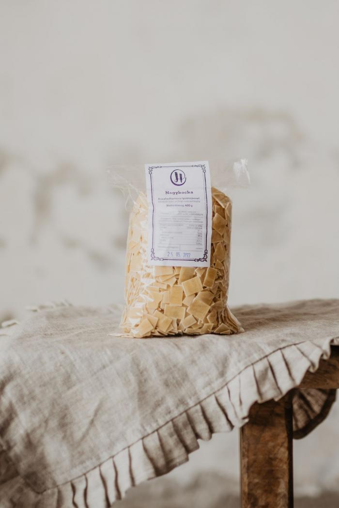 Nagykocka tészta a Heppenheimer család szabadtartású, GMO friss tyúktojásainak felhasználásával készült 8 tojásos házi jellegű száraztészta.