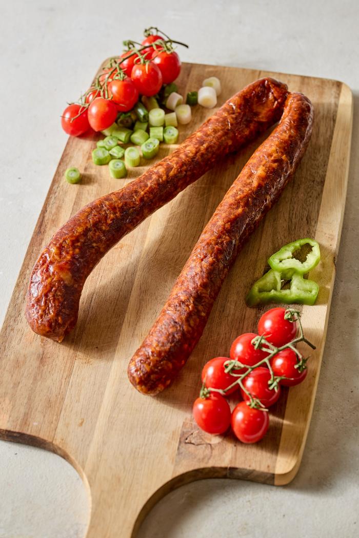 Kömény nélkül, sok fokhagymával készült füstölt csemege kolbász. Feldobja a reggeli omlettet, a